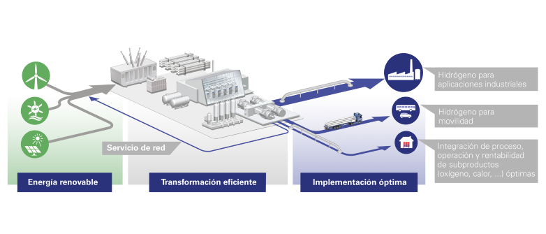 Para nuestro concepto on-site, contamos con socios fuertes, como Siemens Energy, para plantas de producción de hidrógeno basadas en electrólisis en el rango de <1 a 50 megavatios. Esto nos permite implementar soluciones basadas en la demanda para la producción de hidrógeno en aplicaciones industriales como petroquímica, química, alimentaria y siderúrgica, así como en aplicaciones de movilidad como autobuses, camiones o trenes.