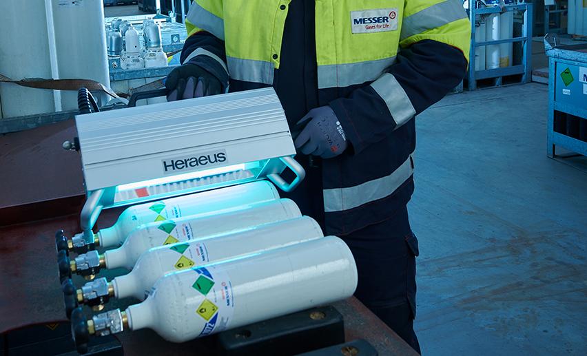 Messer itself is relying on the mobile UV-C disinfection system throughout Europe to disinfect gas cylinders for medical oxygen when hospitals or patients return them for refilling. Disinfection with UV-C light offers many advantages over the chemical approach: it considerably reduces the amount of effort required; it minimizes risks for operators, consumers and the environment; and it lowers the risk of material damage to pressure tanks and their accessories.
