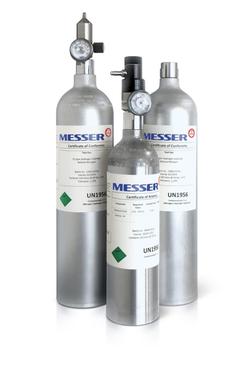 Messer proporciona una amplia gama de gases puros y mezclas de gases en varios tipos de envases de gas. Las mezclas de gas para pruebas se entregan con un certificado de conformidad que se encuentra en la etiqueta del cuerpo del recipiente. Contiene información sobre la composición exacta, las tolerancias y la estabilidad de la mezcla de gases. En función de la mezcla de gases, también puede suministrarse un certificado de análisis. En él se proporciona información más detallada sobre el valor real del componente correspondiente y su incertidumbre.