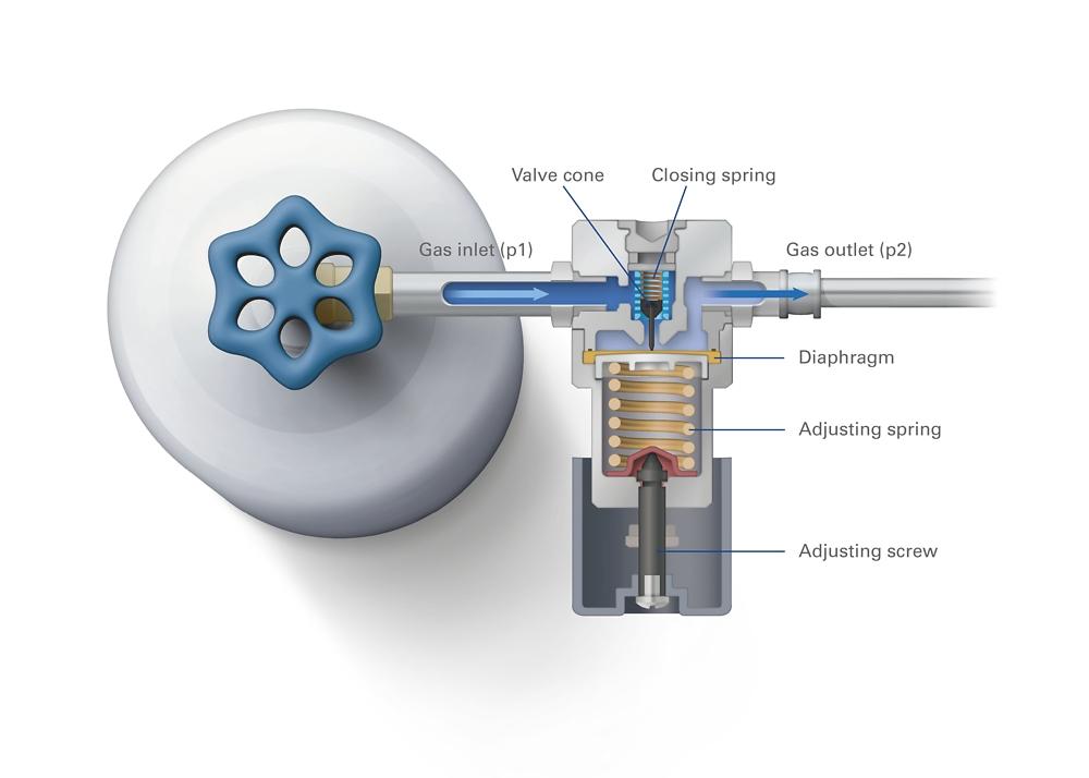 El uso de un diafragma sella el contenido de la botella de gas del entorno y está conectado mecánicamente a la válvula del regulador de presión. Con el tornillo de ajuste del regulador de presión es posible modificar la presión del tornillo de ajuste y ajustar así la presión de salida deseada.